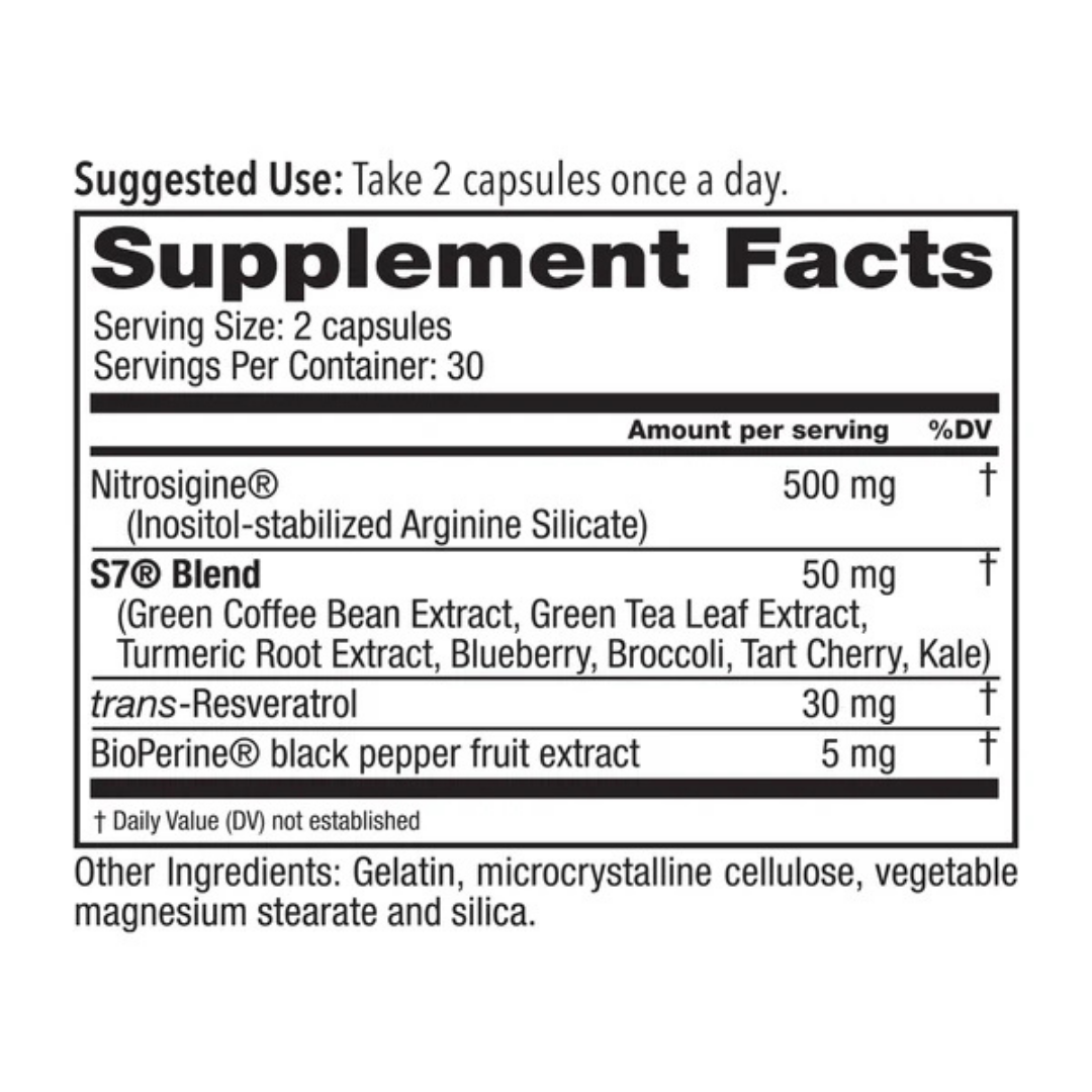 S7® Antioxidant Blend (50mg): Natural plant extracts (Green Coffee, Green Tea, Turmeric, Blueberry, Broccoli, Tart Cherry, Kale) that help support circulation and vascular health.